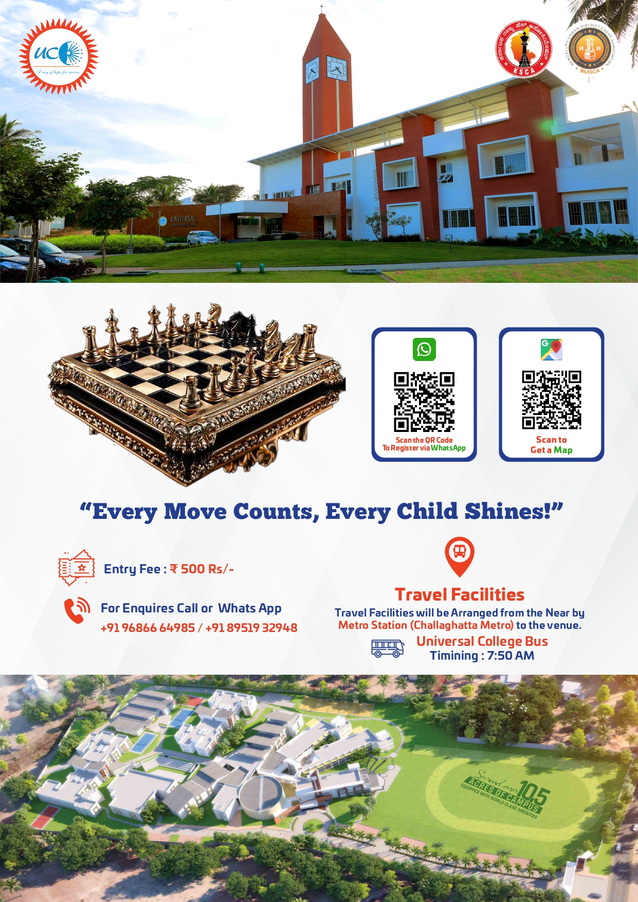 Chess, the game of intellect and strategy, is not just a sport but a powerful tool that sharpens the mind, enhancing cognitive abilities and decision-making skills. Universal Group of Institutions (UGI) is proud to announce the 3rd Universal Age-Category Chess Tournament under the IQAC initiative. This event, set to take place on 22nd November 2025 at 8:30 AM, is organized by the Department of Physical Education and Sports, under the esteemed aegis of KSCA (Karnataka State Chess Association) and BUCA (Bangalore University Chess Association).