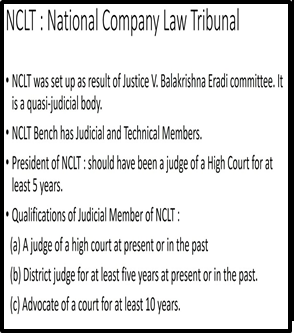 - Adjudicates insolvency resolution process for companies and limited liability partnerships under Insolvency and Bankruptcy Code, 2016.
